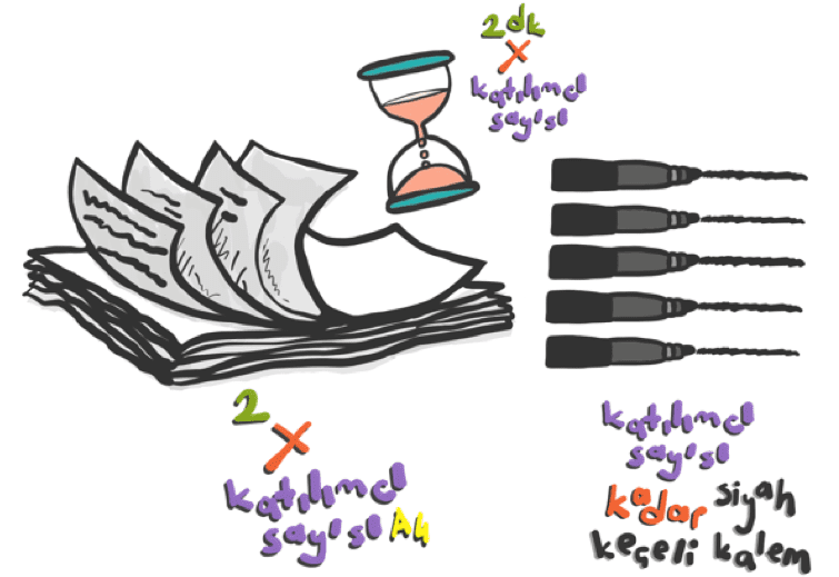 -Her katılımcı için 2 adet boş A4 kağıdı. (Yedek boş kağıtların olmasında fayda var, bazen kağıt yetiştiremediğimiz arkadaşlar olabiliyor.?)