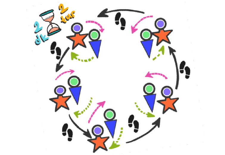 İşaretimizle dış çemberdeki katılımcımız yüz yüze eşleştiği iç çemberdeki katılımcımıza 2 dakikalık Timebox içerisinde kalacak şekilde karşısındaki arkadaşında görmekten keyif aldıkları, onun mutlu eden yanlarını ve kendisinde daha fazla görmeye ihtiyaç duydukları, kişinin gelişim alanlarını paylaşmalarını ve kendisini bir konuda takdir etmelerini ya da bir konu özelinde teşekkürlerini paylaşmasını bekliyoruz. Timebox dolduğunda ise işaretimizle eşlerin vedalaşmasını ve dış çemberdeki arkadaşların bir sağa kaymalarını bekliyoruz. Çember başlangıç noktasına geri dönene kadar çevrimi tamamlıyoruz ve başlangıç noktasına döndüğümüzde bu kez iç çemberdeki arkadaşların aynı formatla geri bildirim ve teşekkürlerini vermelerini rica ediyoruz. Timebox bitimlerinde sağa geçen taraf yine dış çember oluyor. Unutmadan, eğer eşleştiğimiz arkadaşımız aramıza yeni katılan birisi ise bu kez Speed Dating ya da yerine geçebilecek herhangi bir bir ısındırıcı araç kullanıyoruz. Tabi 2 dakikamız olduğu için geri bildirim döngüsündeki gibi tek yönlü işletiyoruz ve tur başa dönüp yön değiştiğinde ısındırıcı aktivitenin kalanını tamamlamış oluyoruz.? 2 turu tamamladığımızda ve tekrar başlangıç noktasına döndüğümüzde ise buluşmamızı bir kapanış cümlesiyle sonlandırıyor ve bir selfie çekiniyoruz.? Bu yöntemi tasarlarken geri bildirimleştiğim çalışma arkadaşlarım Duygu Balcı ve Figen Erkılıç’a da teşekkür etmek isterim.
