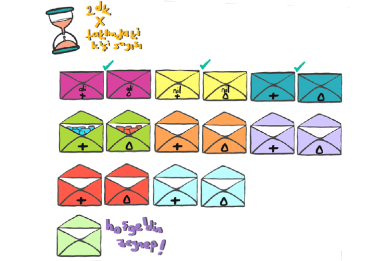 - Bunlara ek olarak fasilitasyon öncesi renkli zarflar edinmeniz ya da hazırlamanız gerekiyor. Her bir takım üyesinin/katılımcının adını taşıyan mini mini renkli renkli Plus, Delta zarfları. Bir de takıma yeni dahil olan arkadaşlar varsa onları da dahil edebilmek adına bir karşılama zarfı güzel olmaz mı?? (Ben 7x9cm zarfları kullandım.) Bu zarfları patafixler kullanarak beyaz bir flip chart kağıdına tutturdum ve bu kağıdı da renkli bir kağıt bantla duvara astım.
